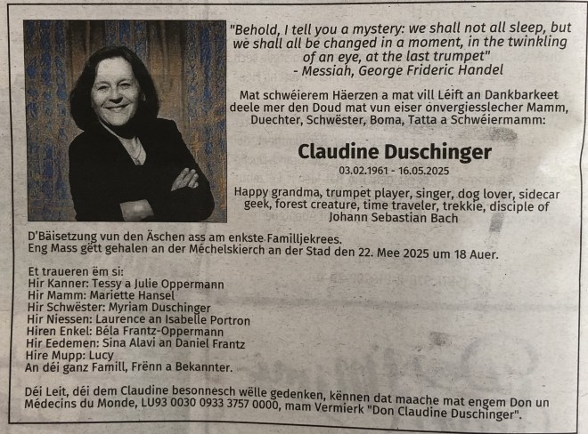 Claudine Duschinger sadly passed away on 16th May 2025 after a battle with cancer.